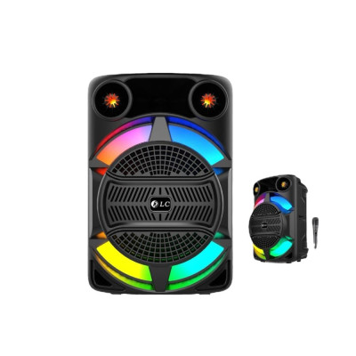 مكبر صوت (سماعة) محمول من نوع “BT PORTABLE SPEAKER” من ماركة “DLC”. يتميز بتصميم عصري وجريء باللون الأسود، مع شبك حماية أمامي ومقابض في الأعلى لسهولة الحمل. الواجهة الأمامية للمكبر تتميز بإضاءة LED ديناميكية وملونة على شكل قوس قزح، مما يضفي عليه مظهرًا جذابًا وحيويًا.